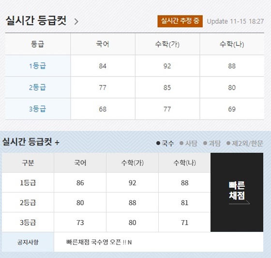 이투스에 이어 메가스터디 역시 실시간 등급컷을 공개했다. 메가스터디 실시간 등급컷에 따르면 국어 1등급 84점, 2등급 77점, 3등급 68점이다. 수학 가형은 1등급이 92점, 2등급이 85점, 3등급이 77점이다. 수학 나형은 1등급이 88점, 2등급이 80점, 3등급이 69점이다.