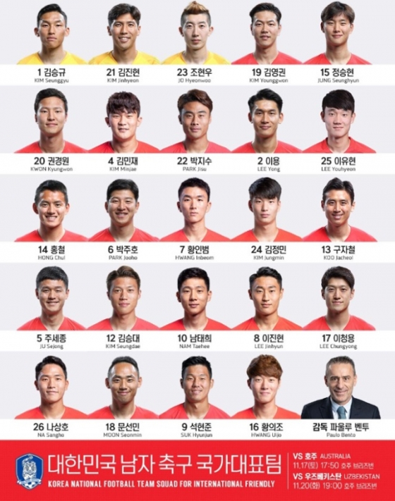 대한축구협회는 15일 공식 홈페이지를 통해 17일 호주, 20일 우즈베키스탄과 친선경기에 나설 대표팀 24인의 등번호를 발표했다.