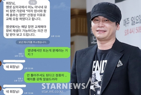 앞서 양현석은 지난 1일 자신의 인스타그램에 "아낙네 뮤비가 왜 문제인지 이제 알았네"라는 글과 함께 YG 직원과 주고 받은 메시지 내용을 캡처해 올렸다. 캡쳐된 메시지 내용에는 YG 직원이 "엠넷 심의국에서 미노(송민호) '아낙네' 뮤직비디오 장면 가운데 '여성 댄서와 춤추는 장면'이 선정성을 이유로 교체 요청을 했다. 엠넷에서는 해당 장면을 교체해야 뮤비 재생이 가능하다고 전달 받았다"고 알린 것에 대해 양현석이 "엠넷에서만 트는 게 문제라는 거지? 안 틀어주셔도 된다고 정중히 말씀 드려"라고 답변하는 내용이 담겼다.