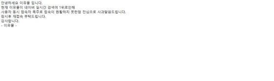이유몰 측은 "현재 이유몰이 포털사이트 실시간 검색어 1위에 올라 사용자 동시 접속자 폭주로 접속이 원활하지 못한 점 진심으로 사과드립니다"며 "잠시 후 재접속 부탁드립니다. 감사합니다"고 밝혔다.