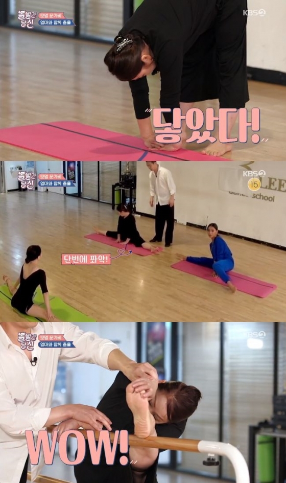 이어 어머니는 다리를 옆으로 완벽하게 찢었다. 또 바에서 하는 스트레칭도 너무나 쉽게 해냈다. 스튜디오에서 오상진은 "저기 다리를 올리는 것부터 힘든데. 대단해요"라며 감탄했다. 강사는 "백 점 만점이예요"라며 감탄했다.