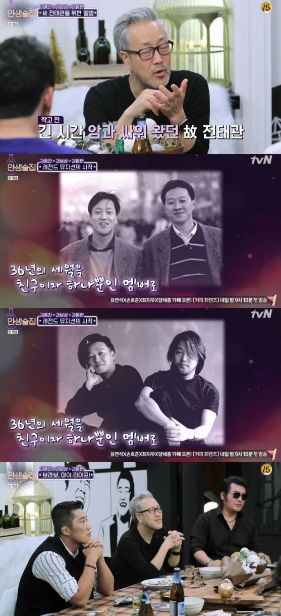 3일 오후 방송된 tvN 예능 프로그램 '인생술집'에서는 김종진, 김보성, 김동현이 게스트로 출연했다. 고 전태관과 함께 봄여름가을겨울로 30주년을 맞은 김종진은 이날 "30년 동안 한 팀을 이어오는 것은 하늘이 점지해주지 않으면 안되는 것"이라며 남다른 감회를 전했다.