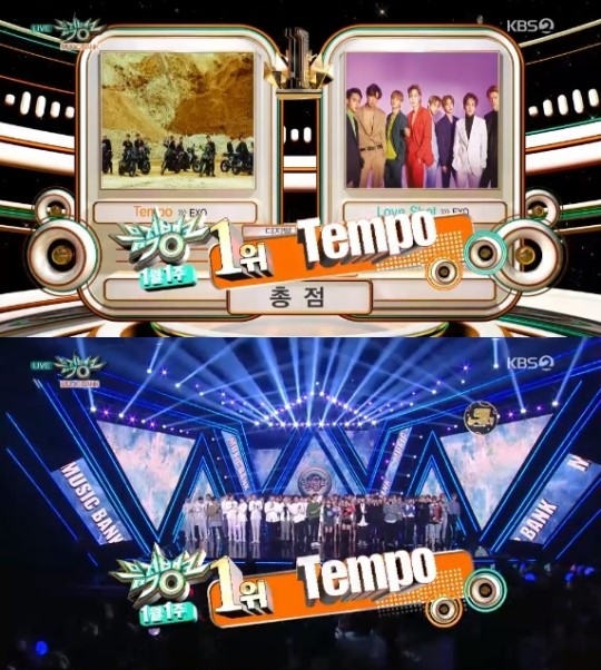 4일 오후 방송된 KBS 2TV 음악방송 프로그램 '뮤직뱅크'에서는 엑소의 '템포(Tempo)'와 '러브 샷(Love Shot)'이 1위 후보로 올랐다.