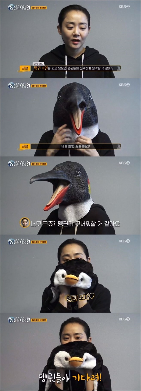 '은밀하고 위대한 동물의 사생활'에서 문근영이 펭귄과 친해지기 위해 펭귄 탈을 준비했다.