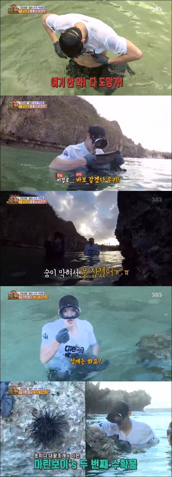 박태환은 "이렇게 잠수를 오래 한 적이 처음"이라며 허탈해 했다. 그때 바위 사이 작은 구멍에서 박태환은 성게를 발견했다. 그는 나뭇가지를 이용해 단숨에 성게를 잡아냈다.
