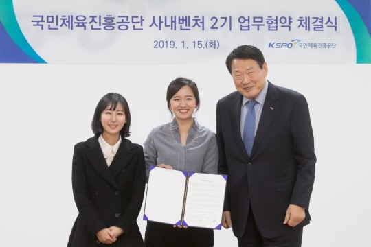 국민체육진흥공단이 15일 올림픽문화센터에서 사내벤처 2기 출범과 함께‘올림픽파크텔 신규수익 모델 창출’을 위한 업무협약 체결식을 가졌다.