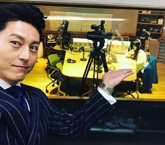 사진 속 류수영은 라디오 방송 진행 중인 박하선을 손으로 가리켰다. 류수영은 훈훈하면서 행복한 미소를 지었다.