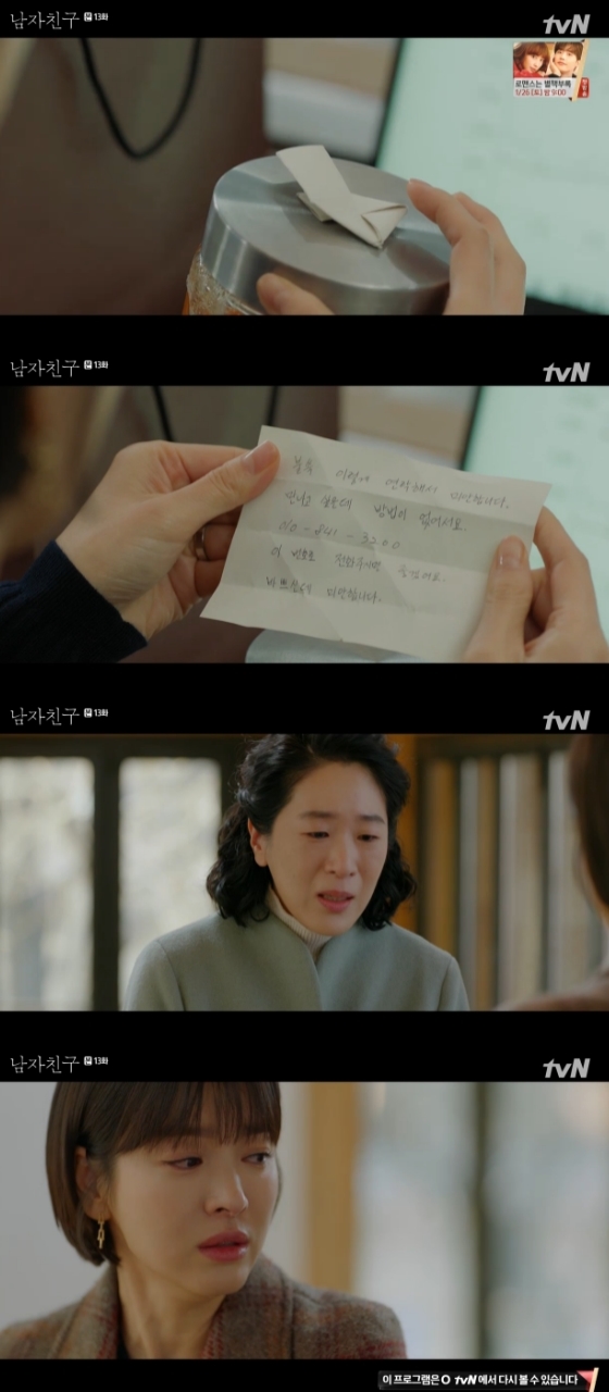 16일 오후 방송된 tvN 수목 드라마 '남자친구'에서 김진혁(박보검 분)의 어머니 주연자(백지원 분)가 차수현(송혜교 분)에게 김진혁과 헤어져 달라고 부탁했다.