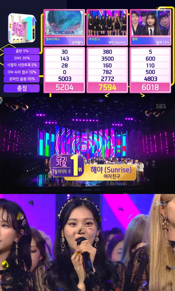 여자친구는 27일 방송된 '인기가요'에서 신곡 '해야'로 1위에 올랐다. 이날 '인기가요' 1위 후보로는 엠씨더맥스와 여자친구, 청하가 올랐다.
