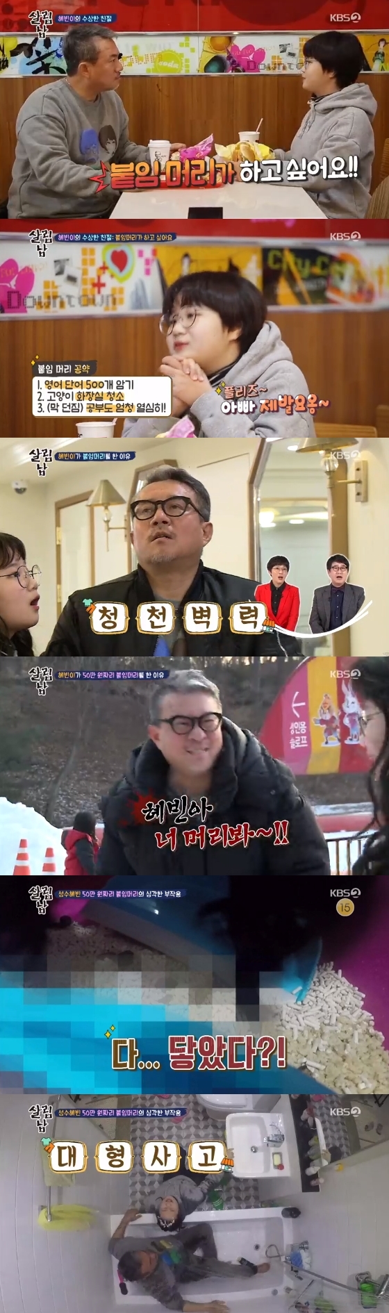 30일 오후 방송된 KBS 2TV 예능프로그램 '살림하는 남자들 시즌2(이하 '살림남2')에서 김성수의 딸 혜빈이 붙임 머리 시술을 받아 긴 머리로 변신했다. 혜빈은 공부에 방해되고 고양이 변에 닿는 등 긴 머리의 부작용을 제대로 체감했다.