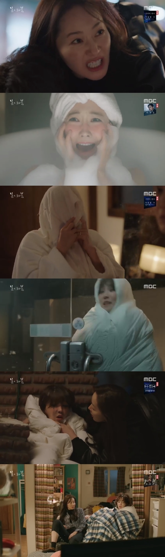 남편 박윤철(최병모 분)과 마주쳤을 때 불이 다시 들어왔고, 당황한 이봄은 황급히 이불 속으로 들어갔다. 침대에서 박윤철이 다가오자 이봄은 이불만 덮고 황급히 도망갔다.