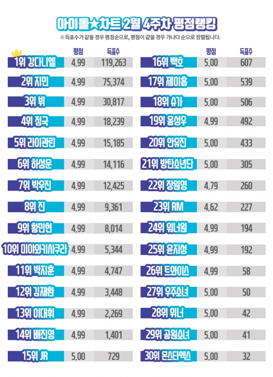 한편 2월 4주차 아이돌차트에서는 '봄의 시작, 3월에 가장 빛날 것 같은 아이돌은?'이라는 주제로 POLL 투표도 함께 진행됐다.