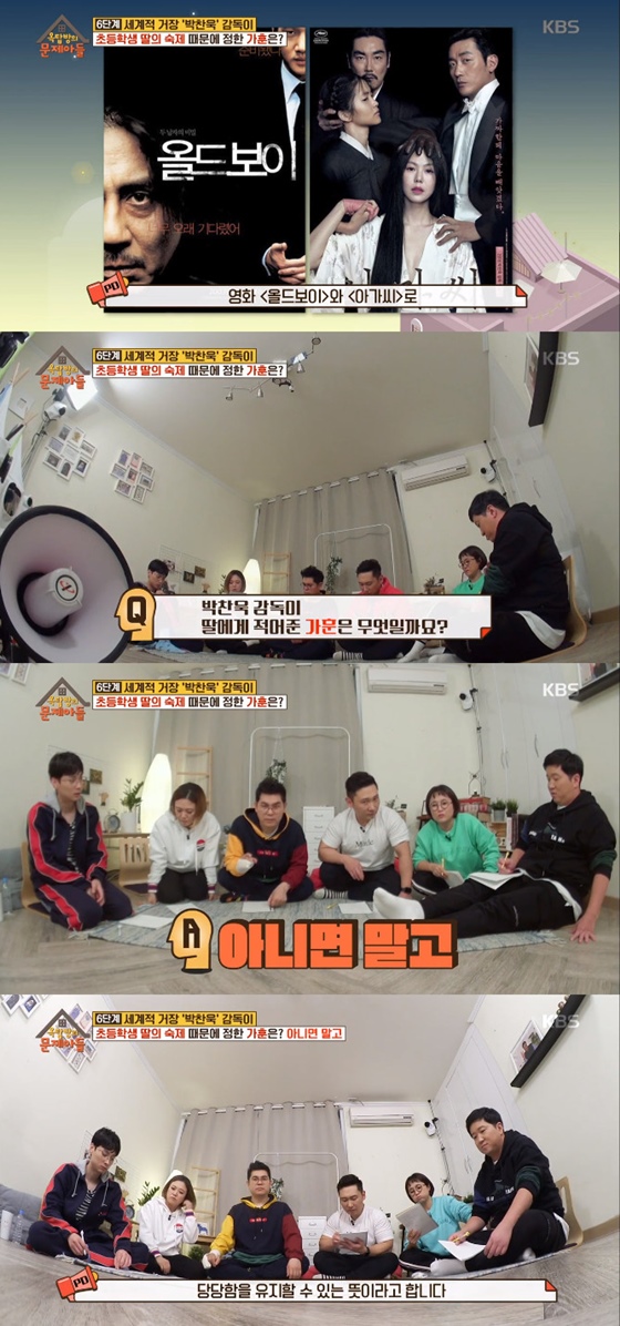 9일 재방송된 KBS 2TV 예능프로그램 '옥탑방의 문제아들'에서는 영화감독 박찬욱의 가훈이 퀴즈로 출제됐다.