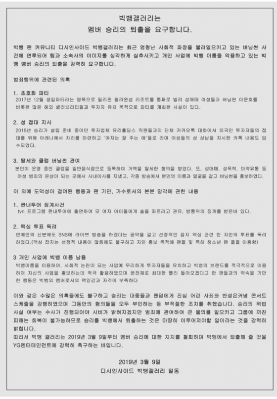 빅뱅 팬 커뮤니티 사이트 '디시인사이드 빅뱅갤러리'에는 9일 "빅뱅갤러리는 멤버 승리의 퇴출을 요구합니다"라는 제목으로 성명서가 게재됐다.
