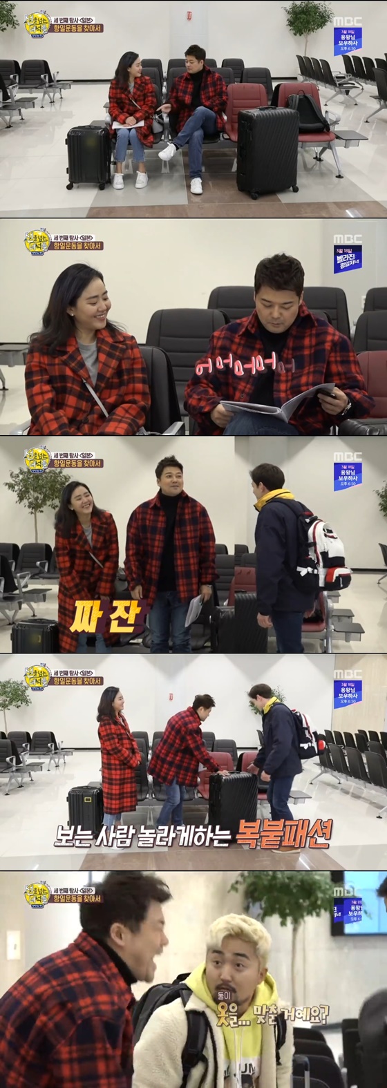 9일 오후 방송된 MBC 예능 프로그램 '선을 넘는 녀석들'에서는 일본으로 떠나기 위해 공항에 모인 문근영과 전현무가 셔츠와 바지, 심지어 흰운동화까지 비슷한 옷을 입고 등장했다.