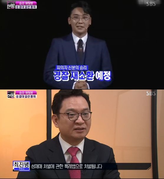 이날 방송에 출연한 최진녕 변호사는 승리의 성매매 알선 혐의에 대해 "성매매하는 과정에서 직접 돈을 주거나 할 경우 성매매 처벌에 관한 특례법으로 처벌된다"며 "외국인 투자자들에게 성관계를 하도록하면서 그 비용을 승리 씨가 지불했는지 여부가 범죄 성립 유무에 관건이 될 것"이라고 설명했다.