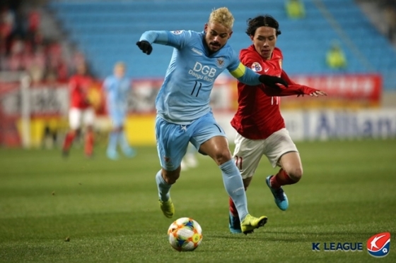 대구가 '우승후보' 광저우 에버그란데를 무너뜨렸다. 12일 홈구장인 DGB대구은행파크서 열린 2019 아시아축구연맹(AFC) 챔피언스리그 조별리그 F조 2차전에서 대구는 에드가의 연속골을 묶어 광저우를 3-1로 제압했다.