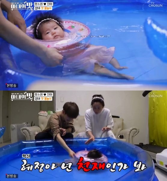함소원은 "천재인가봐"라고 흡족해했고, 진화는 "갓난아이 때 수영을 시키면 뱃속에 있을 때랑 느낌이 같아서 신체발달에 좋다고 한다"고 전했다.