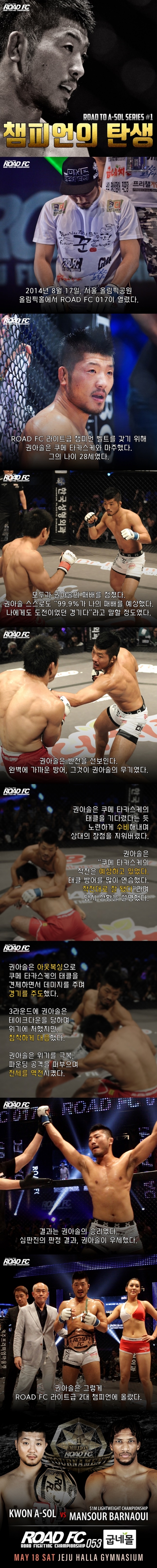 결전을 앞두고 ROAD FC(로드FC)는 15일 권아솔(33·팀코리아 MMA)이 '라이트급 2대 챔피언'에 오르던 순간을 카드뉴스로 제작해 소개했다. 당시 권아솔은 쳄피언 쿠메 타카스케와 대결에서 스스로도 "99.9%가 나의 패배를 예상했다"고 말했으나, 상대의 장점을 면밀히 분석해 승리를 일궈냈다고 로드FC는 평가했다.