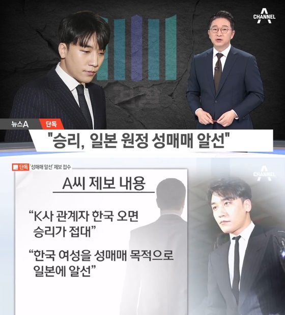 종합편성채널 채널A 뉴스프로그램 '뉴스 A'는 15일 보도를 통해 승리가 한국 여성을 성매매를 목적으로 일본으로 원정 보냈다고 보도했다.