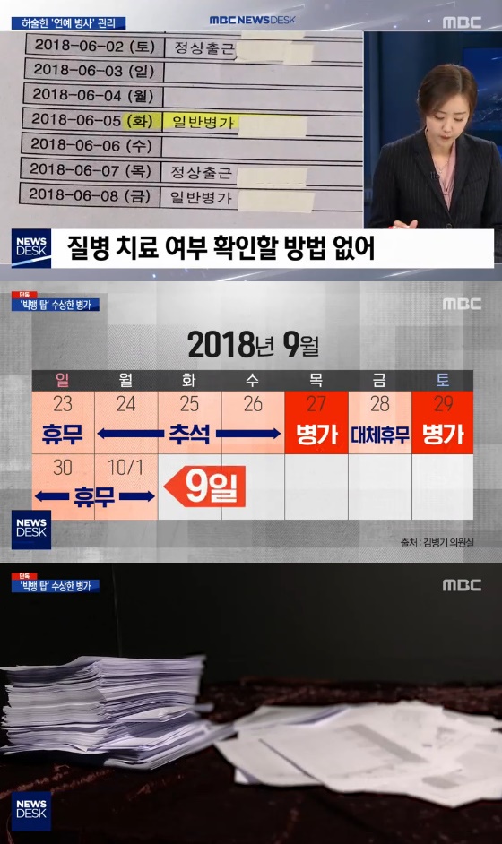 MBC '뉴스 데스크'는 19일 보도를 통해 탑은 9개월간 '1일 병가'만 8번이었지만 한번도 진단서를 제출한 적이 없다고 보도했다.