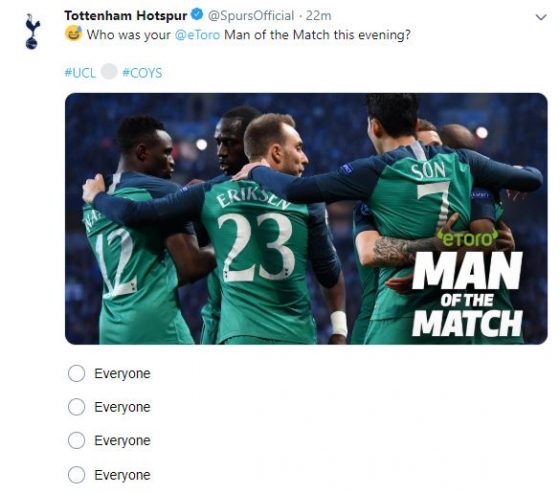 극적인 4강행에 토트넘도 흥분을 감추지 못했다. 토트넘은 매 경기 후 공식 SNS을 통해 MOM 팬 투표를 진행하는데, 이번 투표는 전과 달랐다. 투표 항목 4개가 'Everyone(모두)'으로 통일돼 있었다. MOM 투표가 무의미하다는 뜻이었다.