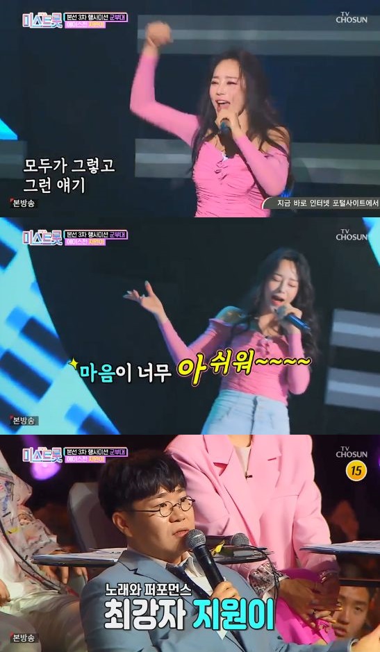 18일 오후 방송된 TV조선 오디션 프로그램 '내일은 미스트롯'에서는 본선 3차 행사미션인 군 부대에서 에이스 전에 나선 미스뽕뽕사단의 지원이의 모습이 그려졌다.