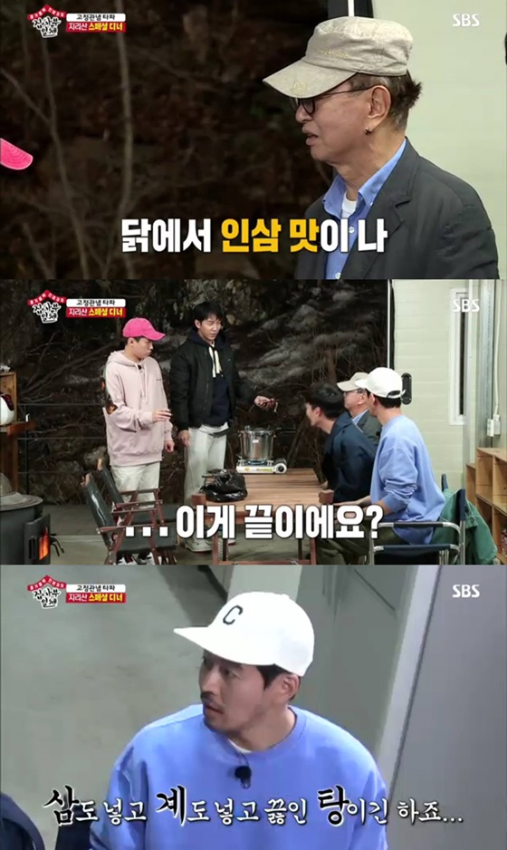 전유성과 멤버들은 저녁 식사를 준비했다. 전유성은 "고정관념을 깨는 삼계탕을 해주겠다"고 해 멤버들의 궁금증을 자아냈다. 그의 삼계탕 레시피는 닭에 물과 무를 넣고 홍삼 진액을 넣는 것.