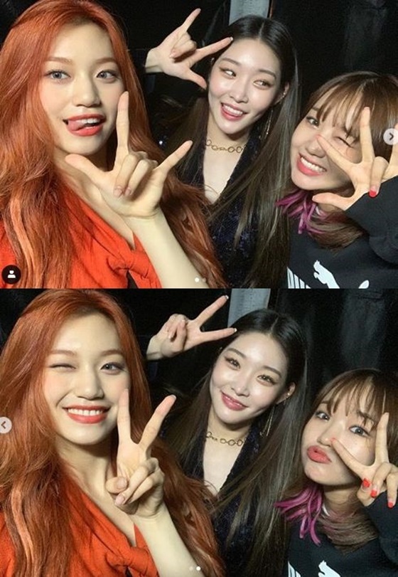 공개된 사진 속 청하는 김도연, 최유정과 함께 손가락으로 브이를 하며 해맑게 미소 짓고 있다.