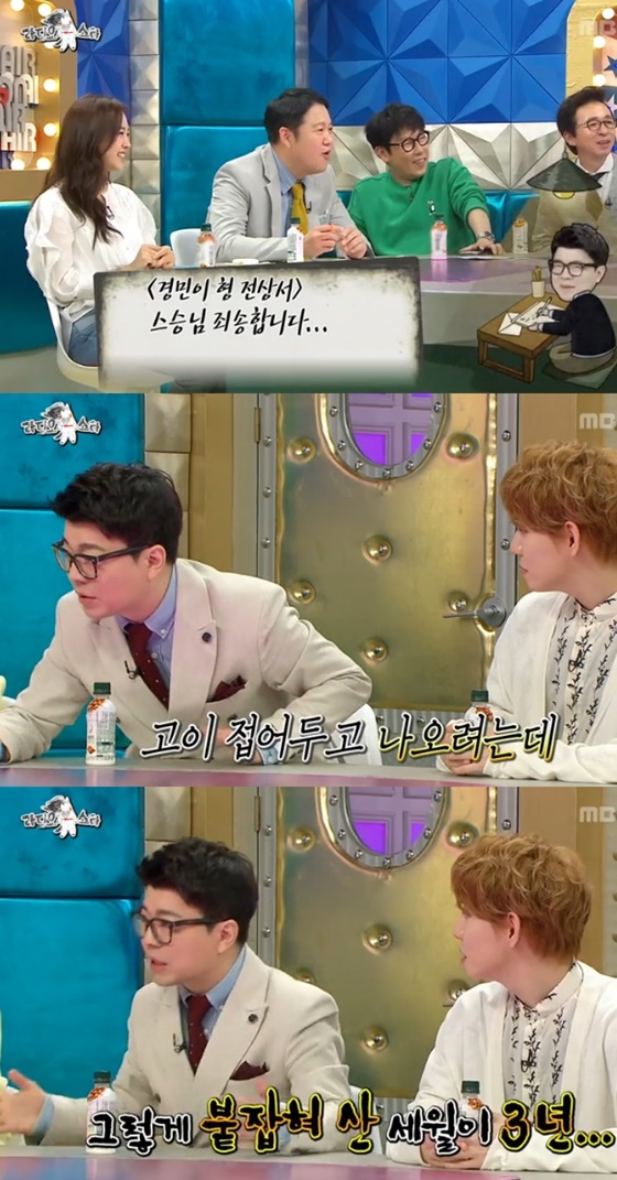 또한 최욱은 "경민이 형이 신혼여행 갔다 온 다음날부터 같이 살았다. 하지만 집에 간다는 나를 형이 보내주지 않았다. 그래서 편지를 써놓고 나가려고 하면 아내분이 '오빠 쟤 도망가'라고 했다. 결국 3년을 같이 살았다"라고 말해 웃음을 자아냈다.