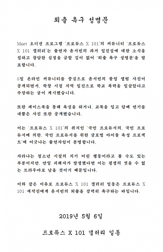 DC인사이드 '프로듀스X101' 갤러리에서는 윤서빈의 퇴출 촉구 성명문을 발표했다.