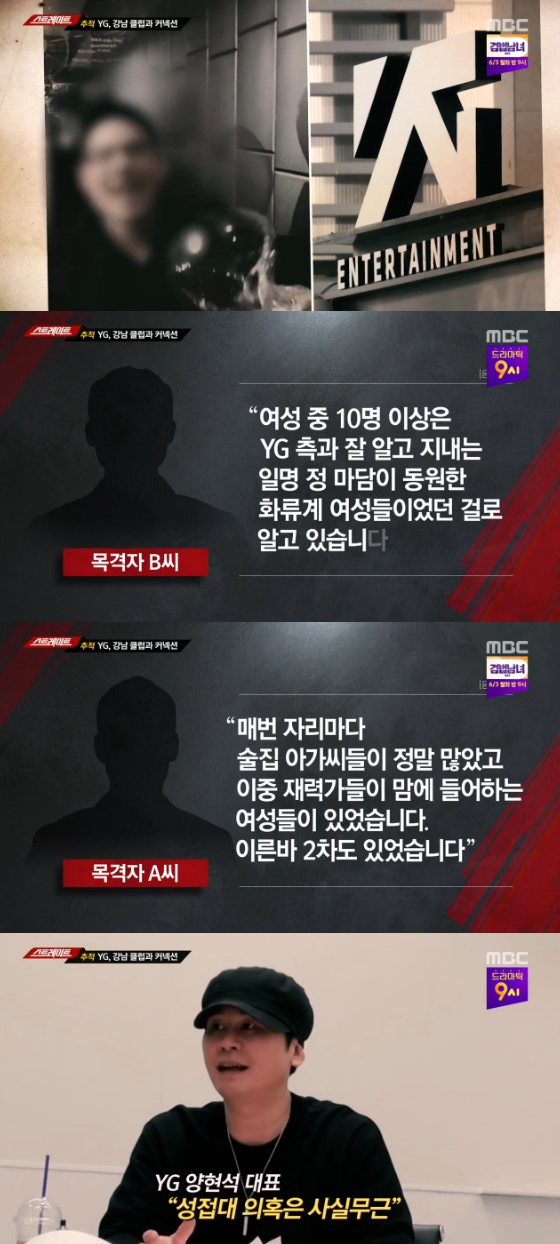 27일 오후 방송된 MBC 탐사 기획 프로그램 '스트레이트'에서는 YG엔터테인먼트의 수장 양현석 대표 프로듀서의 성 접대 의혹을 제기했다.