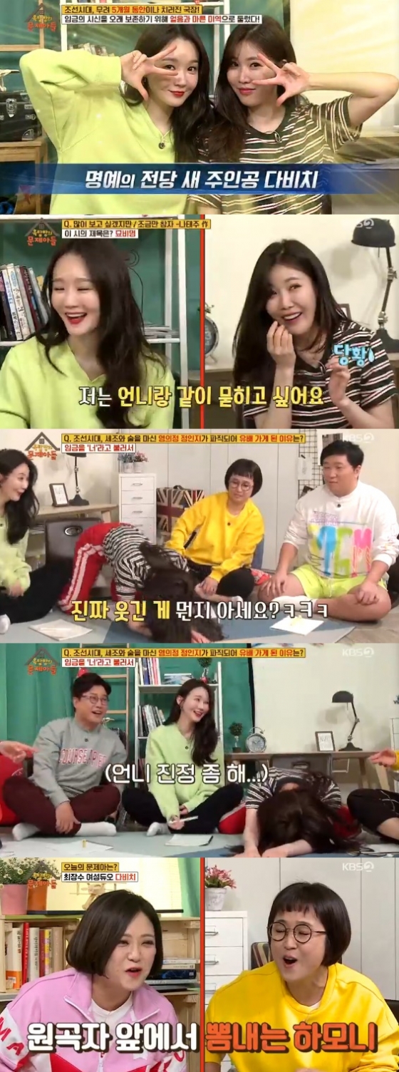 27일 오후 방송된 KBS 2TV 예능 프로그램 '옥탑방의 문제아들'에서는 듀오 다비치가 출연해 옥탑방 남매들(송은이, 정형돈, 김숙, 민경훈, 김성주)과 함께 얘기를 나누며 문제를 푸는 모습이 담겼다.