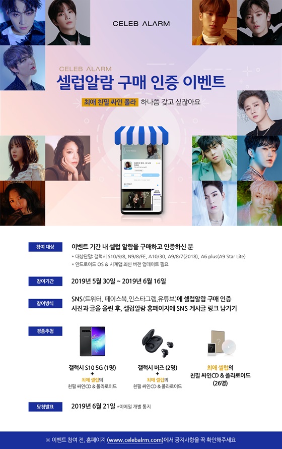 이번 셀럽 알람 구매 인증 이벤트에는 최애 셀럽의 친필 싸인 CD, 폴라로이드 사진 외에도 푸짐한 상품이 준비되어 있다. 알람을 구매한 화면을 캡쳐하여, 필수 해시태그와 함께 개인 SNS 계정에 업로드 후 셀럽 알람 공식 홈페이지에 비공개 댓글을 남기는 팬들 중에서 추첨을 통해 갤럭시 S10, 갤럭시 버즈와 함께 내 셀럽의 싸인 CD, 폴라로이드 사진 등 푸짐한 선물을 제공한다.