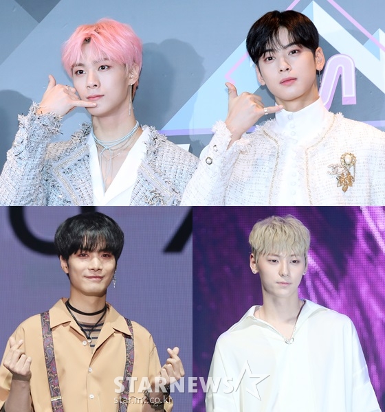 아스트로 멤버 문빈, 차은우와 뉴이스트의 JR과 민현이 셀럽 알람 구매 인증 이벤트에 동참했다.