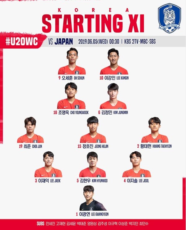 정정용 감독이 이끄는 대한민국 U-20 대표팀은 5일 오전 0시 30분(한국시간) 폴란드 루블린 루블린 스타디움에서 일본과 2019 국제축구연맹(FIFA) 폴란드 U-20 월드컵 16강전을 치른다.