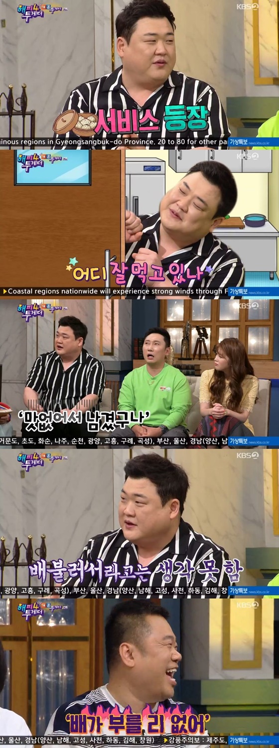 한편 김준현은 식당을 찾았을 때 일어나는 일에 대해 얘기했다. 김준현은 "(식당을 가면) 너무 좋아하시고, 서비스를 많이 주신다. 그런데 조금 부담스러울 때도 있다. 왜냐하면 둘이 가면 기본 3~4인 분 시킨다. 시킨 것만 먹으면 딱 양 찰 정도로 좋은데 꼭 서비스를 주신다"라고 말해 웃음을 안겼다.