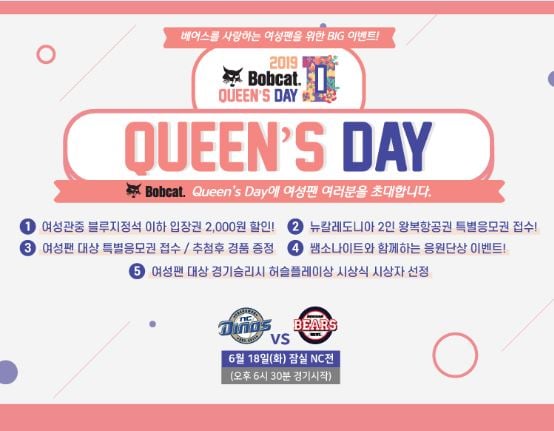 두산베어스가 오는 18일 잠실에서 열리는 NC와 홈경기에서 ‘퀸스 데이(Queen’s Day)’ 이벤트를 실시한다고 7일 밝혔다.