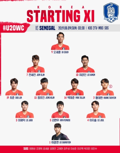 한국은 3-4-2-1 포메이션으로 세네갈과 맞선다. 일본과 16강전에서 결승골을 넣은 오세훈이 최전방 스트라이커로 선다. 왼쪽 날개에는 전세진, 오른쪽 날개에는 이강인이 각각 배치됐다.