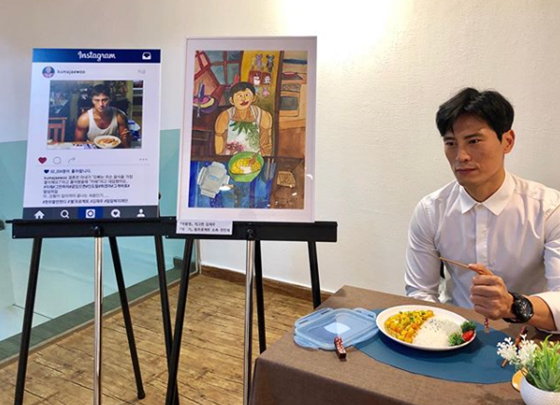 사진 속 김재우는 자신의 인스타그램 사진 전시와 함께 카레 앞에서 생각에 잠긴 듯한 표정을 짓고 있다.