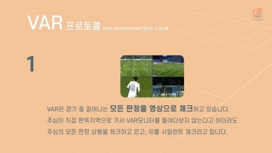 이에 연맹은 ▲VAR의 기본 개념, ▲VAR의 원칙과 절차, ▲VAR이 적용된 실제 K리그 경기장면 분석, ▲자주 제기되는 질문에 대한 답변 등을 담은 홍보 영상 ‘VAR의 모든 것(VAR’s A to Z)’을 제작, 배포했다. ‘모션그래픽’ 방식을 사용하여 약 20분 간의 설명이 전혀 지루하지 않게 느껴진다.