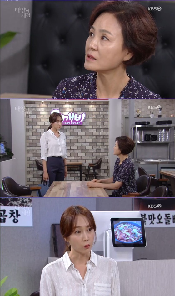 29일 오후 방송된 KBS 2TV 일일드라마 '태양의 계절'에서 채덕실(하시은 분)이 임미란(이상숙 분)에게 오태양(오창석 분)의 생모에 대해 묻는 모습이 그려졌다.