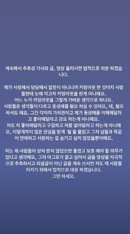 저는 제 사람들이 상처받지 않았으면 좋겠고 보호해야 할 의무가 있다고 생각해요. 그저 어그로가 끌고 싶어서 글을 영상을 자극적으로 추측하시고 피셜 글이 아닌 글을 계속 쓰시면 저도 제 사람을 지키기 위해서 법적으로 대응하겠습니다.