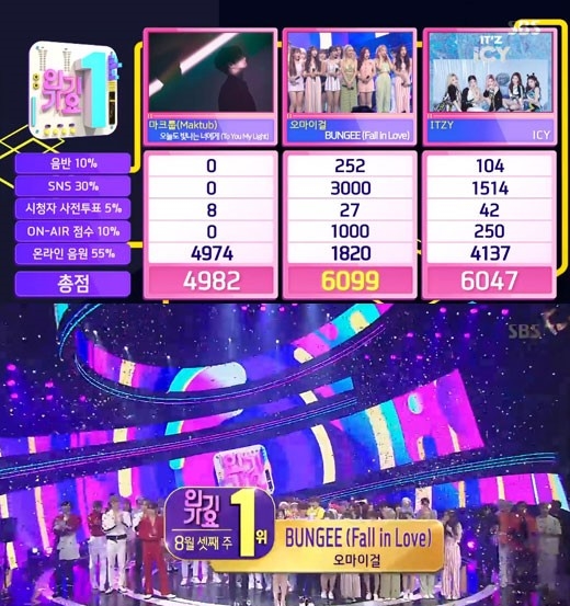 18일 오후 방송된 SBS 음악방송 프로그램 '인기가요'에서는 ITZY, 오마이걸, 마크툽이 1위 후보로 오른 가운데 오마이걸이 1위를 차지했다.