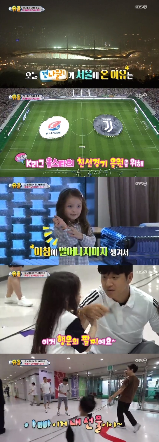 18일 오후 방송된 KBS 2TV 예능 프로그램 '슈퍼맨이 돌아왔다'에서 대박이와 나은이 건후는 K리그 올스타 친선경기를 응원했다.
