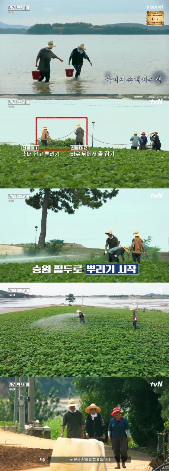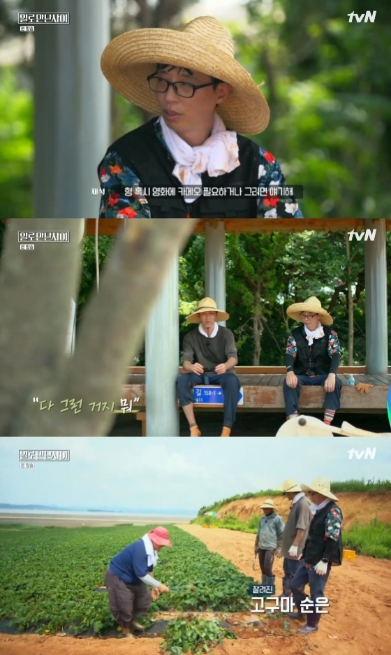 31일 오후 방송된 tvN 예능프로그램 '일로 만난 사이'에서 차승원과 유재석이 고구마밭 노동에 전념했다.