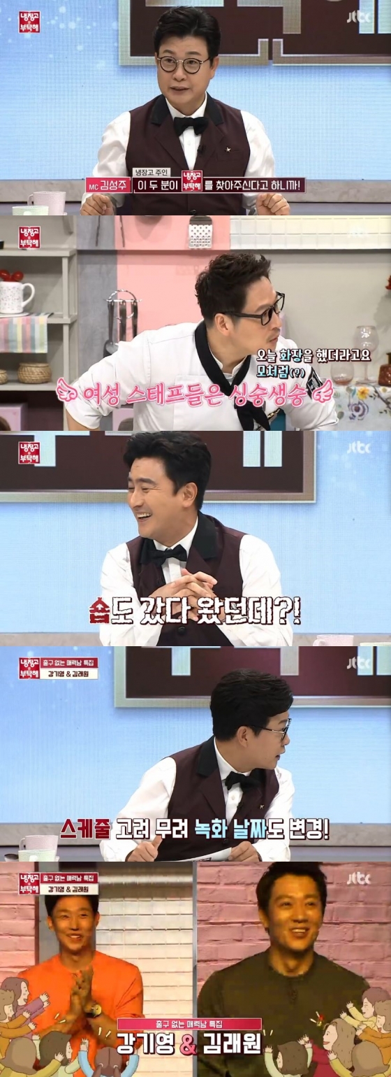 16일 오후 방송된 JTBC 예능 프로그램 '냉장고를 부탁해'에서는 게스트로 김래원, 강기영이 출연해 얘기를 나누며 요리를 지켜보는 모습이 담겼다.