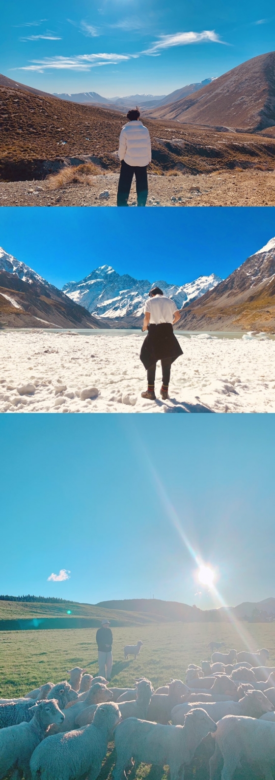 또 다른 사진 속 뷔는 완벽한 풍경을 자랑하는 장소에서 검은색 바지와 흰색 패딩을 입고 포즈를 취하고 있어 눈길을 끈다.