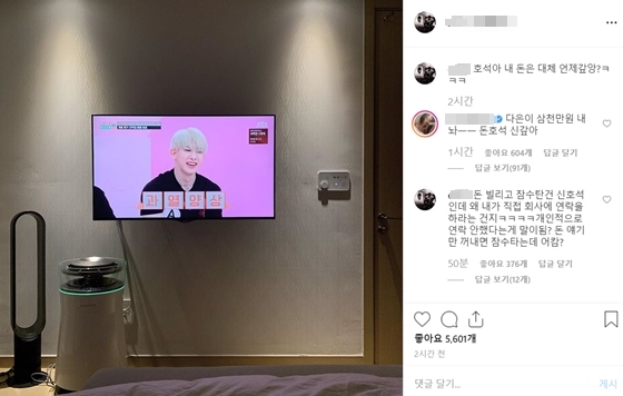 정다은은 29일 오후 자신의 인스타그램에 TV에 JTBC '아이돌룸'에 출연한 원호의 모습이 담긴 사진과 "호석아 내 돈은 대체 언제 갚앙? ㅋㅋㅋ"라는 글을 게재했다.
