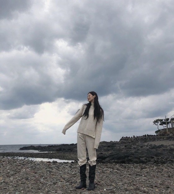 공개된 사진 속 서현은 베이지색 니트와 면바지 차림으로 바닷가 돌 위에 서 있다.
